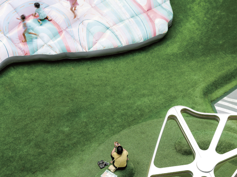 人們會在這裡曬太陽,小孩則坐在草坪上看書、吃零食,我們很高興看到大家都能在平台草地上享受生活。